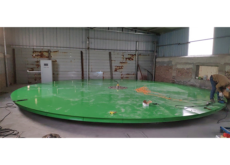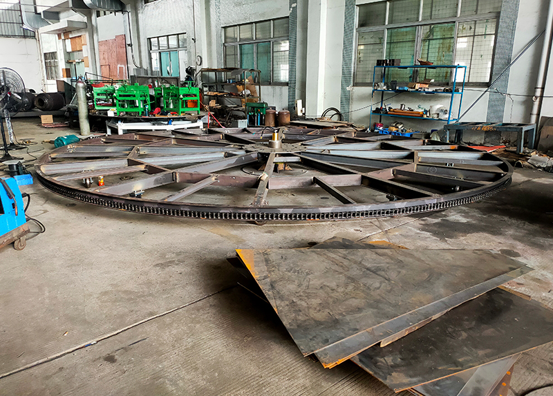 5.轉盤主結構骨架使用國標工字鋼,封閉結構,盤面保證平整不變形。中心承重座底部使用止推軸承負責承載,錐滾軸承保證定位,保證轉動的精度和可靠性。