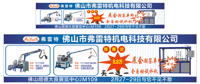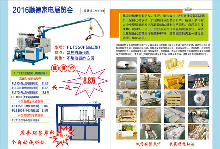 2016年2月27-2月29日弗雷特聚氨酯發(fā)泡機(jī)參加了順德廚衛(wèi)生活電器展,地址:佛山順德大良展覽中心,展位是2M109。參加本次展會(huì)旨在將性價(jià)比最高的聚氨酯發(fā)泡機(jī)面眾于世,經(jīng)過技術(shù)升級(jí)改良,機(jī)器功能用途廣泛,覆蓋面廣,歡迎社會(huì)人士前來觀展!
