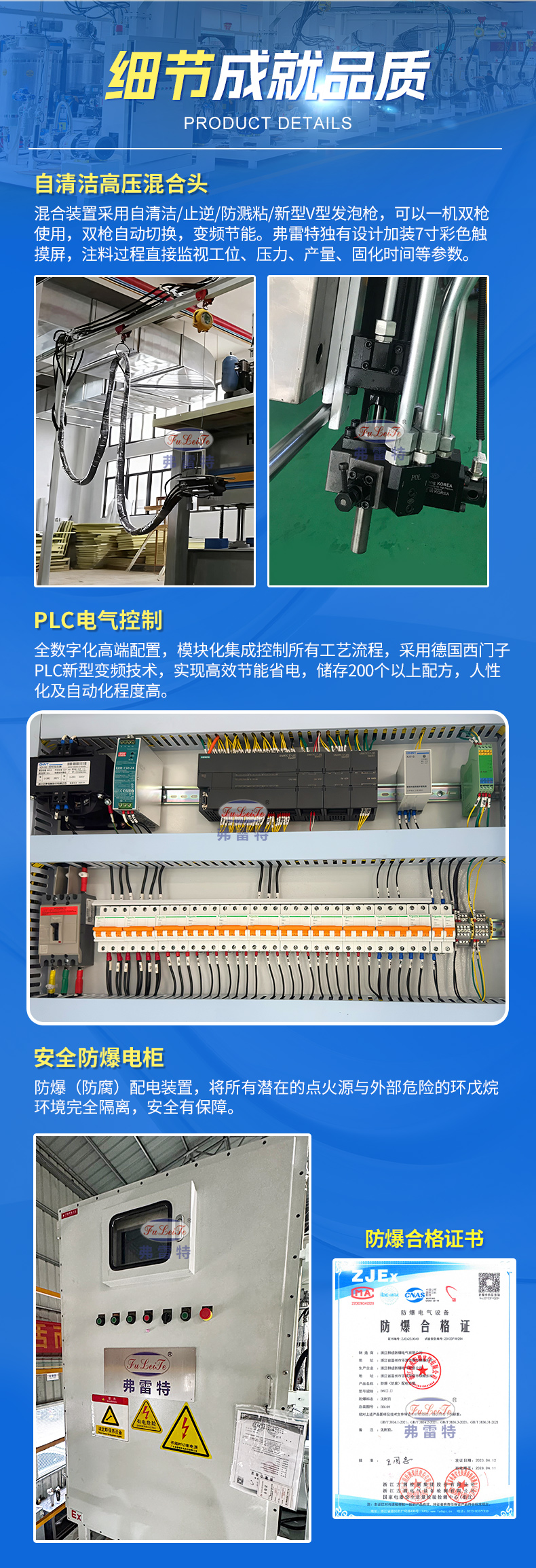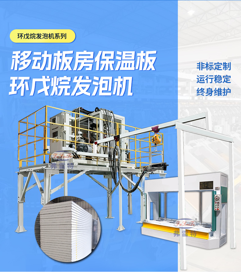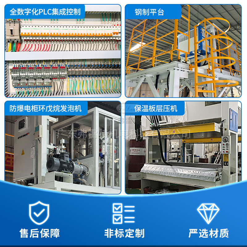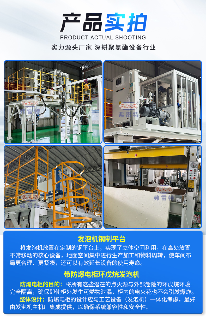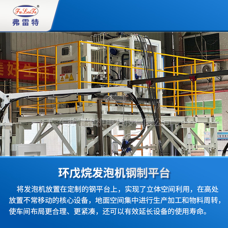 這是做移動方艙外墻板的客戶定制的一臺帶防爆電柜的環戊烷發泡機,將發泡機放置在定制的鋼平臺上,實現了立體空間利用,在高處放置不常移動的核心設備,地面空間集中進行生產加工和物料周轉,使車間布局更合理、更緊湊,還可以有效延長設備的使用壽命。