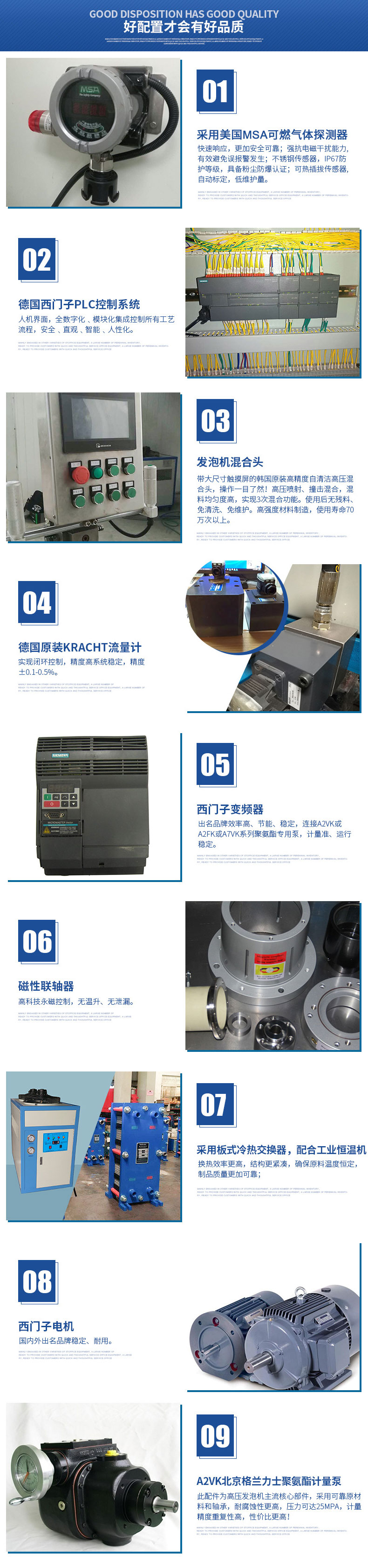 具有西門子PLC+雙變頻多功能安全裝置,38個智能自檢保護點,獨立防靜電房,烷氣濃度等級自動識別系統,自動2-3級抽風系統,西門子防爆電機,獨立導地裝置,槍頭引線靜電導出裝置等,外接2組獨立對比恒溫,12~100種噴灌定時定量控制,開槍溫度鎖定,故障自檢報警等,本系統采用自清潔/止逆/防濺粘/新型V型發泡槍(實現3次混合功能),結構美觀、操作方便。根據客戶實際情況,還可以一機雙槍使用,雙槍自動切換,變頻節能、應用自如,專為客戶量身訂做發泡完善系統。
