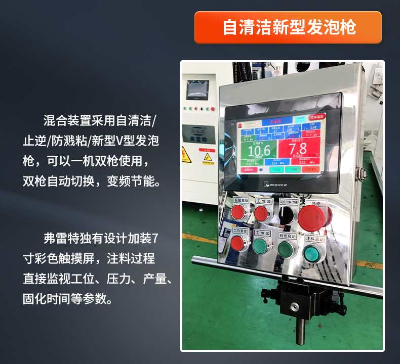 混合裝置:本系統采用自清潔/止逆/防濺粘/新型V型(實現3次混合功能)發泡槍,結構美觀、操作方便。配合西門子聚氨酯專用泵,注射準,混合效果很好。
